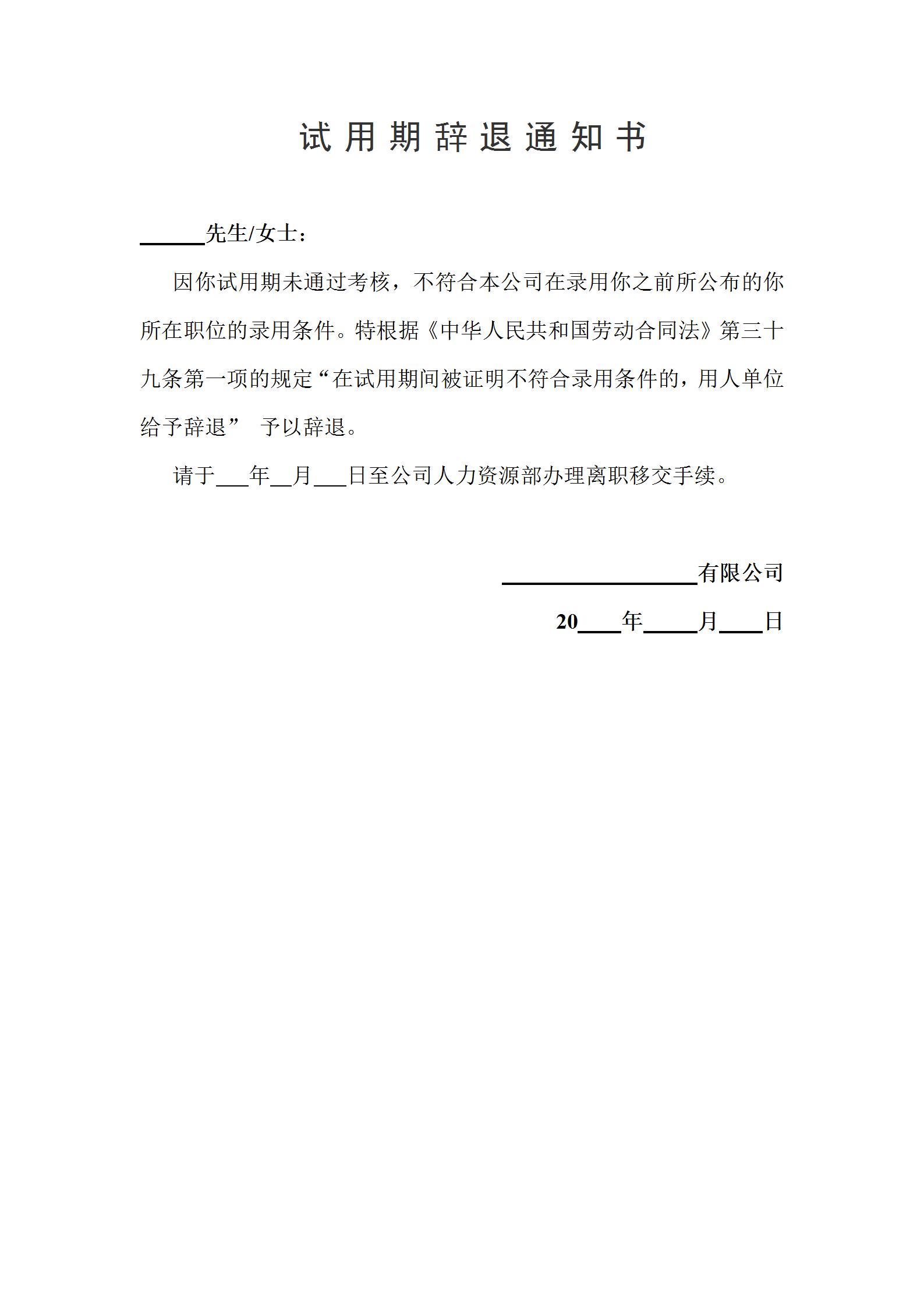 因你试用期未通过考核,不符合本公司在录用你之前所公布的你所在职位的录用条件。
